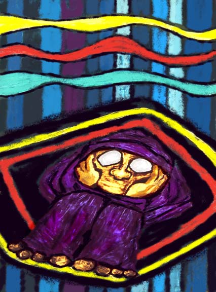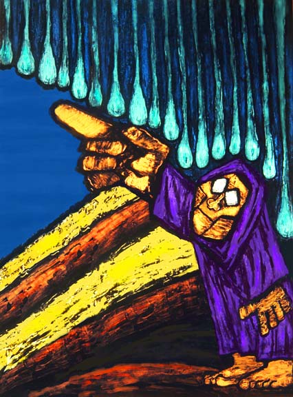 I was originally fascinated by the adventures of the prophet Elijah before I even became a Christian when I worked in an art studio with eleven other artists. One of the artists was quite different from the rest of us. He was one of the most humorous men I have ever met, but he was also an extremely fundamentalist Christian. One of his personal methods of witnessing to his faith was to read his Bible out loud at break times. Really loud! During one of these sessions he read the story of Elijah. He read a short segment each day as if it were a soap opera series. However, he read the story with a humorous Jewish accent. Being from the New York City area he was quite good with the accent. He would have the whole studio of artists laughing as he even had God speaking in the Jewish accent. He would always end each day's segment relating that part of the story to Christian faith and God's love. Even at that time I was impressed with that wild story about Elijah and the humor found in the Bible. I knew that someday I would have to express Elijah's adventures in artwork. That goal became more meaningful after I finally did understand God's Love and Grace through the witnessing of my wife and that funny Christian artist in that art studio years ago. The artwork on Elijah became a reality in the early 1970's when I was inspired to create a series of seven acrylic paintings on his story. I wanted the depictions to have a humorous character relating to how I heard the story read in the art studio years before. My cartooning background inspired me to draw Elijah as just a little, meek man with no power of his own, but with his eyes wide open to God using His power through him in faith. Now, many more years later I have revisited the Elijah art series and have slightly revised the compositions to fit a new format by using computer art drawing. I have tried to retain the character of the early paintings while enhancing the expression. I also added an eighth composition, "Casting the Mantle." The current final Elijah series is computer mediated ink jet prints. I still laugh as I remember that strange Christian artist with his funny Jewish accent reading the adventures of Elijah from his beat up, old Bible during break times in that art studio many years ago. Robin Jensen