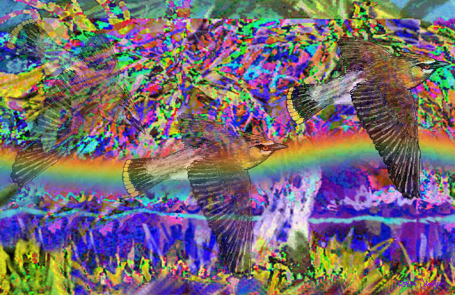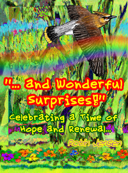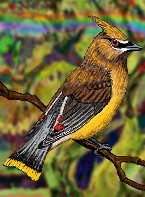 The Cedar Waxwing Blues... I just had to draw the artwork of the beautiful Cedar Waxwing as a kind of memorial and apology for its fate in flying into the grille of my Miata MX-5 while I was driving at 55 MPH on a Michigan country road. Along with friend Ed Carrigan, I was returning to Grand Rapids after we had worked at a check point for the National 24 Hour Bicycle Challenge on a Saturday afternoon. It was a beautiful, sunny day and I had the top down on the Miata. As we were talking above the roar of the wind some birds flew by the front of the car. Ed said, “A bird just flew into your grille!” I thought he was joking. The next day I did check the grille, which seems to look like a hungry mouth. And, there was a bird stuck to the radiator! After removing the bird I was able to identify it as a Cedar Waxwing. A beautiful bird... Oh man, I felt chagrined and sorry... I used the bird and additional reference to draw an apologetic, memorial artwork and express the beauty of one of God’s precious creatures. Robin Jensen