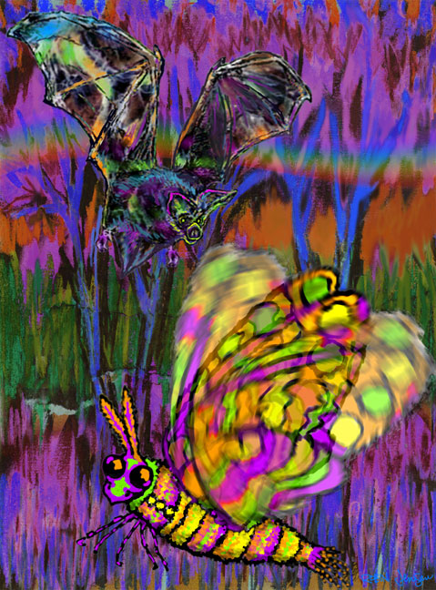 Jazz sounds at twilight… Bats are fascinating… Not the baseball type, The unique flying mammal type. Another of God's fantastic and special creatures. Like jazz musicians they fly at twilight And make wild, exciting sounds That help them find food. Echolocation…something like radar… Bouncing cool sounds through the evening air. That's how they locate and try to snare Their favorite dinner item… moths. However, the moths are cool… They have a radar detection system! They can hide or fly evasive maneuvers When they hear a bat in the vicinity. And some moths can even jam a bat's radar With their own jazzy sounds… So they can thwart and evade the bats And fly another day Adding to the cool jazz sounds at twilight… A nightly jam session! Poem by Robin Jensen, inspired by the many unique and fascinating creatures in God's creation.