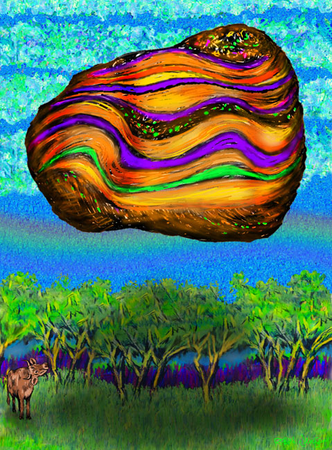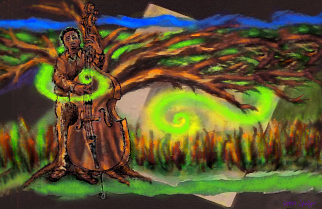 Night Flights… The sky is always dark For an angry jazz musician When God does not resolve… Without any idea of redemption. But hope, like jazz, is always poised to take flight. The rogue tree reaches out into that dark sky With jazz sounds…a double bass riff… A tone like a cathedral bell That speaks of love… And the need for healing. The music reflects the soul of the tree: Savage changes in tempo Layers of overlapping textures Soaring colors Raucous and joyful…a street parade in the sky! The Spirit moves in and through the tree: The music does resolve God And expresses hope and joy With the healing Grace of love That makes everything clear… And resolved… Poem by Robin Jensen inspired by the intriguing jazz compositions by the legendary Charles Mingus. The influence of God's common Grace is symbolized by the joyful wind flowing in and through the tree in the artwork.