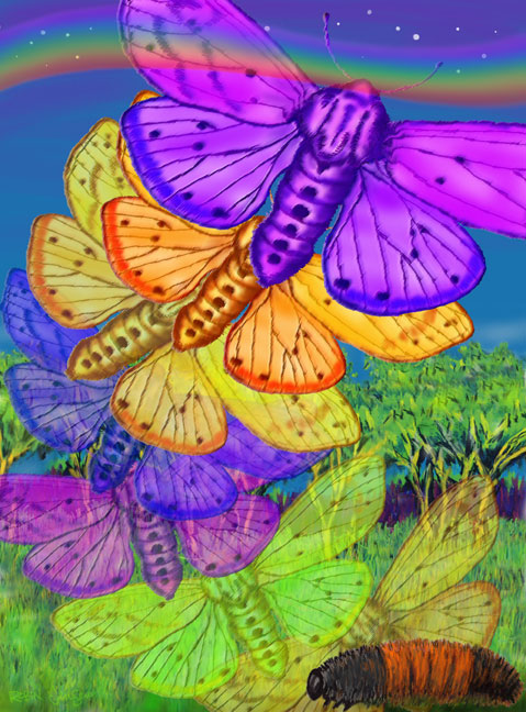Isabella Tiger Moth Dreaming… Walking…trotting… running…going…running… Cold…summer must be over…running…going… After feeding and moulting…feeding and moulting… All summer long…growing…changing…running… Going… traveling…to a special place… But where? Must keep going…run…faster…run…run… Across fields, grass, rocks, sand…harvested land… Across a wide gray desert…large, noisy monsters Roaring by…smoke…acrid odors…Watch Out! A monster rolled close by…run…run fast… Strange, hungry creatures everywhere… Roaring by…run…run… Must find a shelter, a home for the cold time…winter… Hibernation…sleep…dream… Suddenly it's very cold…slowing down…stop… A shelter…curl up…rest…sleep… Hibernation… Dreaming…colors…wings…flying… Yellow…green…puce…magenta…orange…scarlet… Purple! Suddenly it's warm…hot…spring. Awake…hungry… Walking…trotting… running…going… Where…? Metamorphosis…! Cocoon…changing…reforming…transformation… Fulgent colors…wings…flying… Yellow…green…puce…magenta…orange…scarlet… Purple! Poem by Robin Jensen, inspired by the cute woolly bear caterpillars seen on my fall bicycle tours.