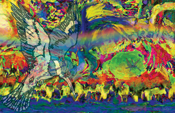 Waiting by the River… The Live Oak waits… And contemplates… Along the bustling river bank. The Kingfisher is ready to dive… A fishing line floats through the air Causing vibrating distortions. Fractal patterns burst forth… Creating Mandelbrot Sets… Fantastic repetitions in space. Colors Shout… Textures cry out expletives… Watch out Brown Trout! Poem by Robin Jensen, inspired by the wonderful mysteries of God's creation. Fractal: A geometric pattern that is repeated at every scale. Benoit Mandelbrot, a French mathematician, invented fractals. Mandelbrot Set: A set of complex numbers that has a highly convoluted fractal boundary when plotted.