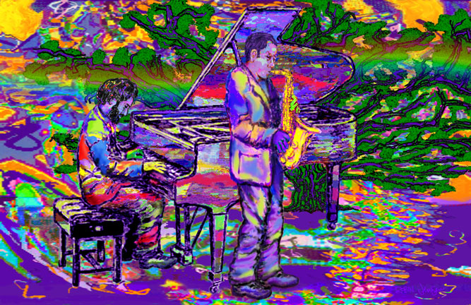 Jazz to the Power of Three!... The alto sax soared... The piano danced in other dimensions... Melodic sounds broke free From the bounds of gravity. Savage changes in tempo. Layers of overlapping textures. Brilliant colors... ostinato contrasts... Raucous riffs... bizarre licks... The two musicians inspired each other To new heights... outer space... The music reflected their shared goal To push jazz beyond the limits And resolve their life purpose By making good music With God's common Grace... This Jazz to the Power of Three Still resonates today With its joyful affirmation Of the love of life. Poem by Robin Jensen, inspired by the wonderful music created by Art Pepper on alto sax and Milcho Leviev on piano in the late 1970's and early 80's.