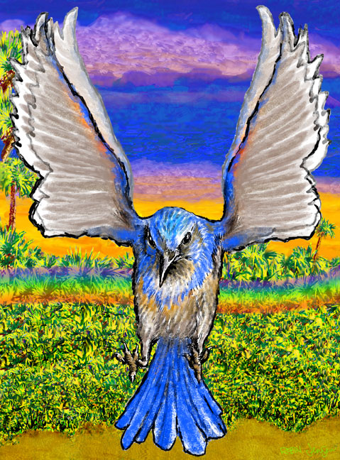 The Friendly Florida Scrub Jay… The dry, sandy scrublands of Central Florida Are the exclusive home of a friendly bird. But, scrublands are easy to clear for construction Resulting in the building of homes for humans And the loss of habitat for the Florida scrub jay. However, the scrub jays are still friendly And trusting of humans… Stand in an isolated scrubland area With a peanut in an out stretched hand. And soon a jay will land in a nearby bush And check you out. Suddenly it will trustingly land on your fingers, Cock its head and look at you, Then gratefully fly away with your offering, Soaring like the wind with the freedom Only birds seem to have… This trusting nature of a scrub jay inspires me… Approaching the hand of a big human Just seems to me to be an allegory Of our trust in God… Of course, God offers us more than Just a peanut! Poem by Robin Jensen, inspired by the friendly, trusting Florida scrub jays in an isolated area of scrubland in the Sun ‘n Lake community near Sebring, Florida.